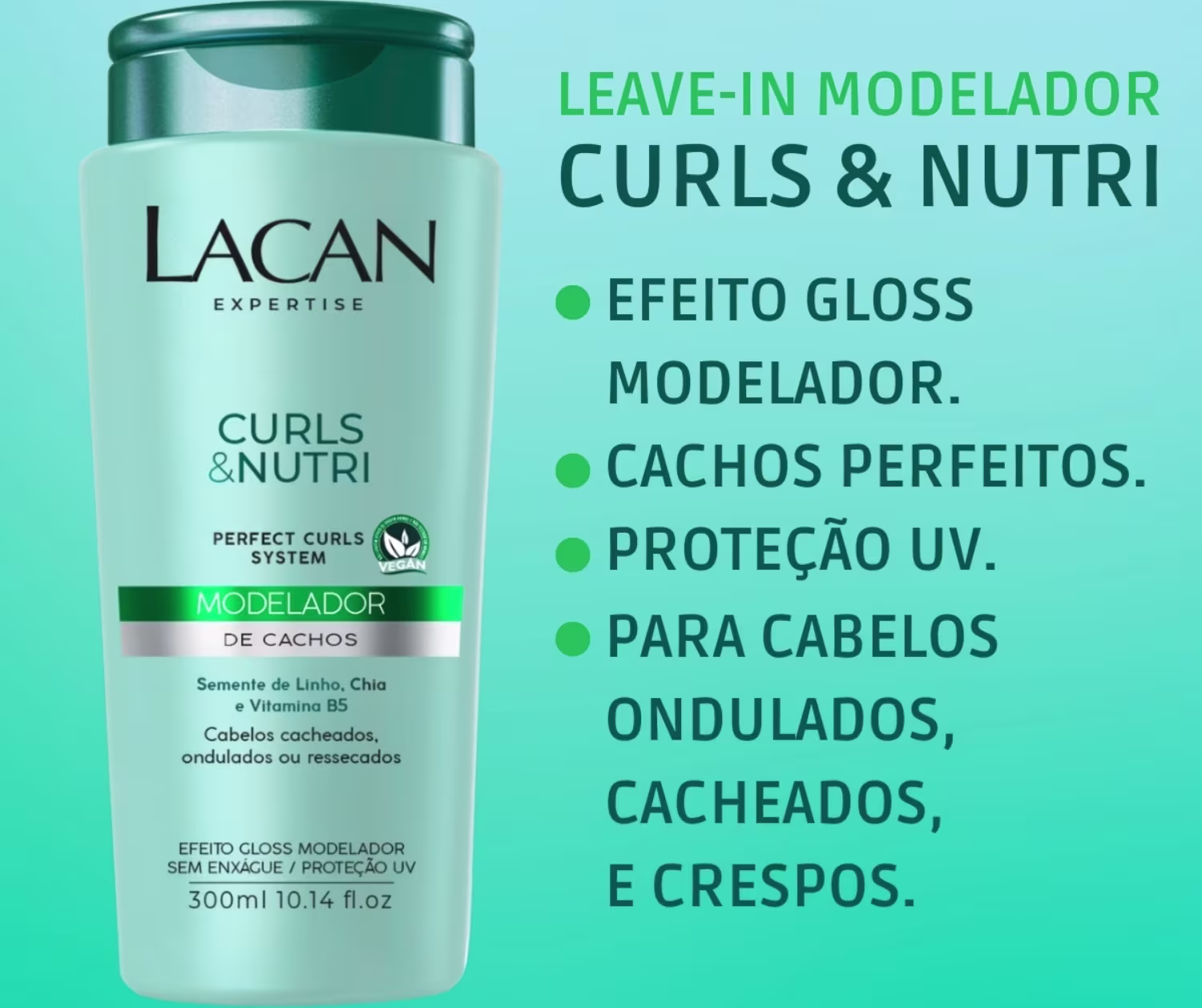 A linha CURLS & NUTRI LACAN à base de óleo de moringa, macadâmia e colágeno, nutre e protege os cabelos cacheados, ondulados, crespos ou ressecados. Melhora a penteabilidade, controla o volume e define os cachos. Fórmula com tecnologia Perfect Curls System, combinação exclusiva de ativos emolientes para promover máxima hidratação aos fios.