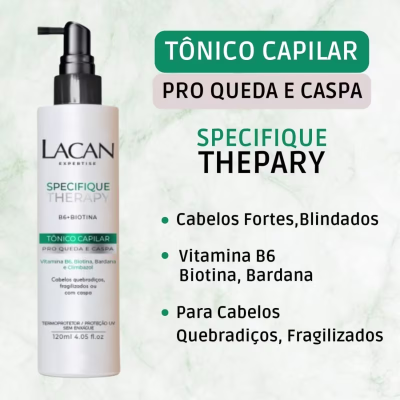 O TÔNICO CAPILAR PRO QUEDA E CASPA SPECIFIQUE THERAPY LACAN foi desenvolvido com a combinação dos ativos Biotina, Bardana, Vitamina B6 e Climbazol, juntos agem diretamente no couro cabeludo, auxiliando no combate da quebra dos fios e o fungo causador da caspa. Equilibra o microbioma evitando assim que suja novos focos do problema. Age diretamente no bulbo capilar, eliminando a oleosidade excessiva e estimulamando o crescimento natural, garantindo cabelos fortes, blindados, totalmente renovados e saudáveis. Proporciona agradável sensação de frescor.