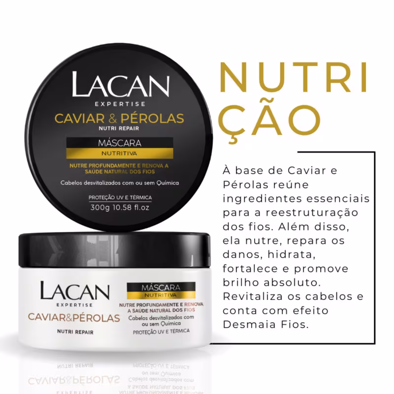 MODO DE USAR: Aplicar no cabelo úmido, massageando o couro cabeludo, distribuindo suavemente o produto por toda a extensão dos fios e enxaguar. Repetir o procedimento, se necessário. Uso diário. Para resultados ainda mais surpreendentes sugerimos o uso dos demais produtos da linha NUTRI REPAIR CAVIAR & PÉROLAS LACAN.