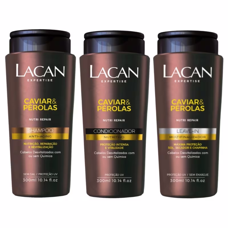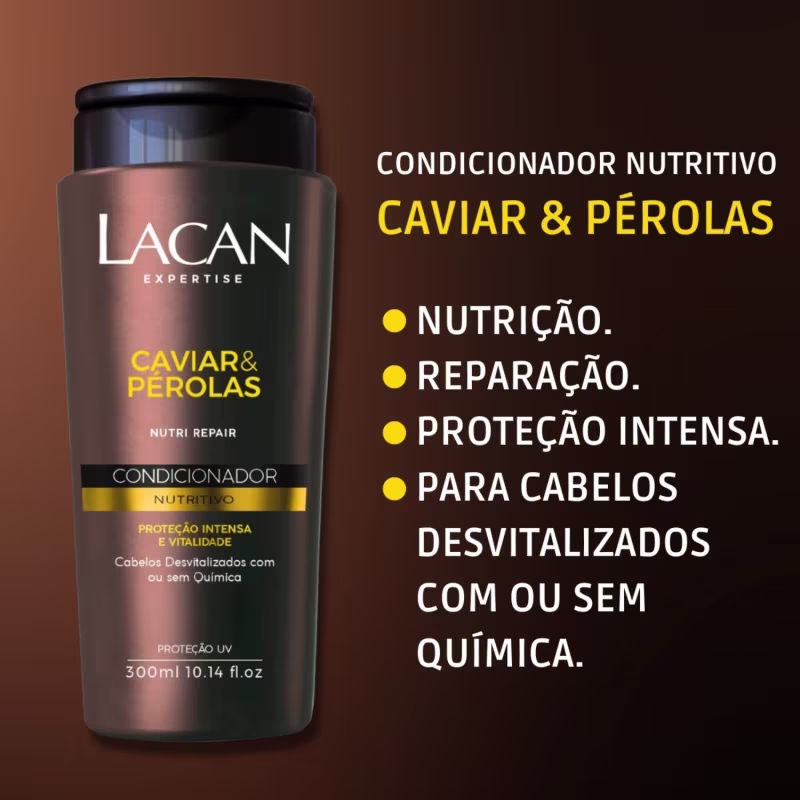 MODO DE USAR: Aplicar no cabelo úmido, massageando o couro cabeludo, distribuindo suavemente o produto por toda a extensão dos fios e enxaguar. Repetir o procedimento, se necessário. Uso diário. Para resultados ainda mais surpreendentes sugerimos o uso dos demais produtos da linha NUTRI REPAIR CAVIAR & PÉROLAS LACAN.