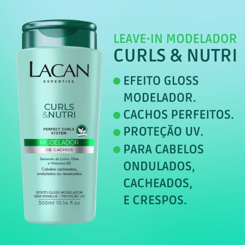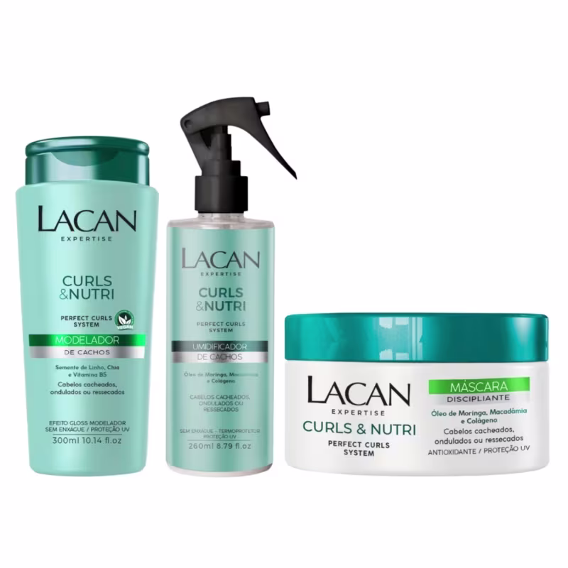 A linha CURLS & NUTRI LACAN à base de óleo de moringa, macadâmia e colágeno, hidrata, nutre e protege os cabelos cacheados, ondulados, crespos ou ressecados. Melhora a penteabilidade, controla o volume e define os cachos. Fórmula com tecnologia Perfect Curls System, combinação exclusiva de ativos emolientes que promovem hidratação máxima aos fios. Enriquecido com filtro solar, protege intensamente os fios. Possui excelente ação antifrizz e hidratante. Promove suavidade, maciez e brilho natural.