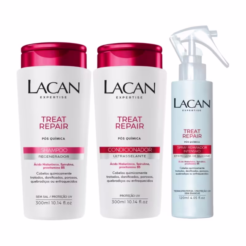 A sinergia de ativos de altíssima qualidade, ricos em proteínas, vitaminas, sais minerais, açucares e ácidos graxos, conferem a linha TREAT REPAIR LACAN um tratamento cosmético único. Com alto poder de nutrição e recontrução atua de forma inteligente na reparação dos fios danificados por processos químicos, mecânicos ou desgastes naturais deixando-os revitalizados e resistente a quebra, resgata o brilho e a saúde da fibra, elimina o aspecto de ressecamento. Confere cabelos com movimento natural, extremamente macios, bonitos, saudavéis. O spray reparador intensivo luva de silicone, forma um filme protetor que envolve os fios como uma luva, preserva a umidade natural, promove toque macio, protege e restabelece a saúde natural da raiz ás pontas.