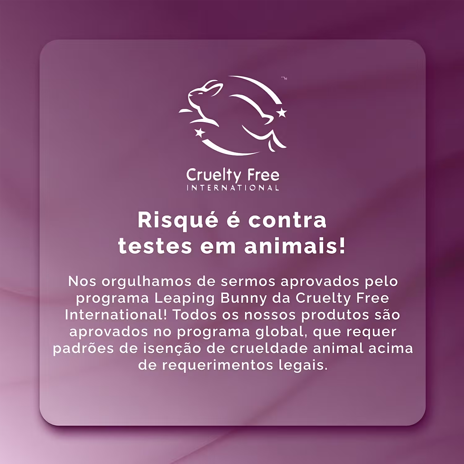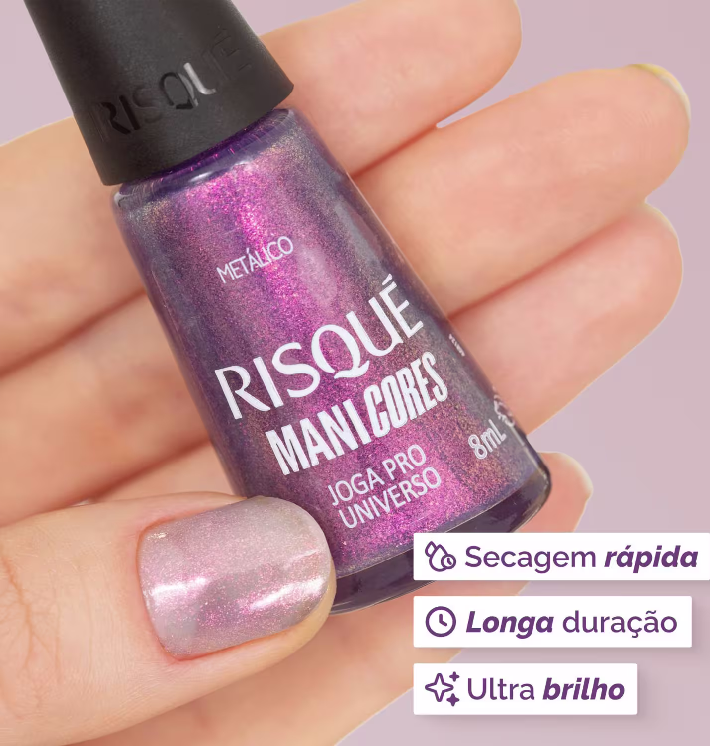 O esmalte roxo Risqué ManiCores Joga Pro Universo é metálico, de secagem rápida e com ultra brilho. Seu pincel proporciona uma aplicação perfeita e alta cobertura. Além disso, possui longa duração e fórmula hipoalergênica, sendo livre de componentes que costumam causar alergias. Todos os produtos Risqué são aprovados pelo programa Leaping Bunny da Cruelty Free International, padrão ouro globalmente reconhecido para produtos livres de crueldade animal.