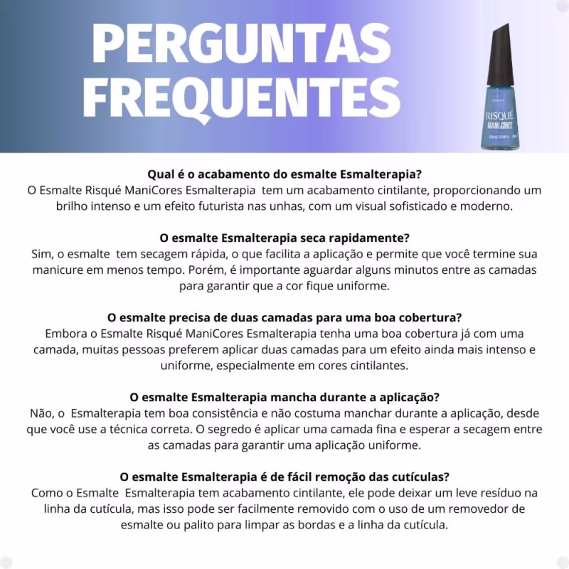 O esmalte azul Risqué ManiCores Esmalterapia é cintilante, de secagem rápida e com ultra brilho. Seu pincel proporciona uma aplicação perfeita e alta cobertura. Além disso, possui longa duração e fórmula hipoalergênica, sendo livre de componentes que costumam causar alergias. Todos os produtos Risqué são aprovados pelo programa Leaping Bunny da Cruelty Free International, padrão ouro globalmente reconhecido para produtos livres de crueldade animal