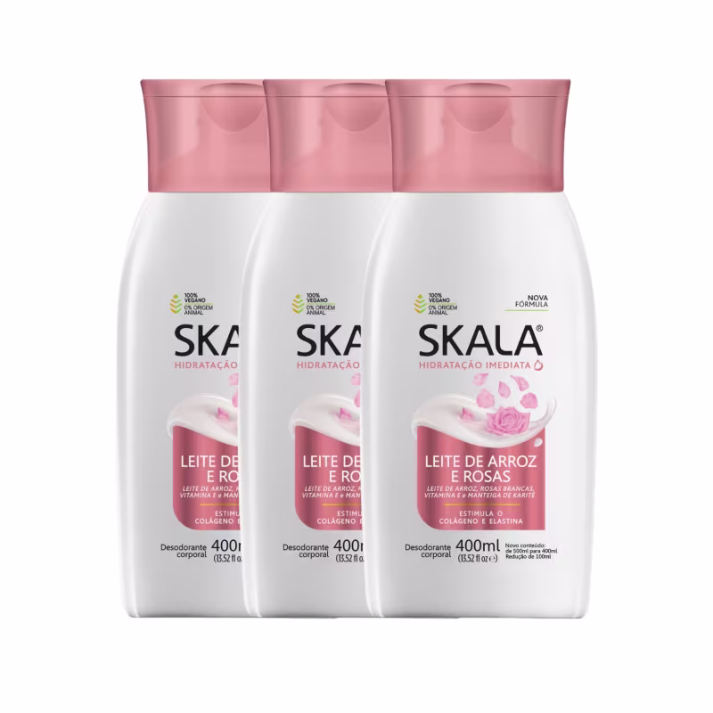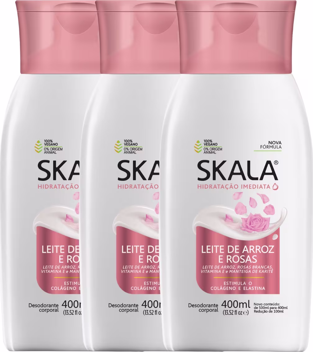 Com o Kit 3 Loção Creme Hidratante Corporal Arroz E Rosas Skala, você garante não só uma pele bem cuidada, mas também um toque irresistível de maciez e perfume. Aproveite para manter seu estoque de hidratação e garantir um toque de cuidado especial todos os dias!