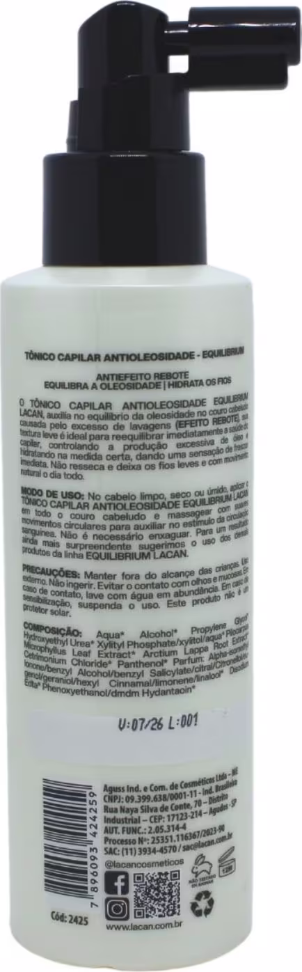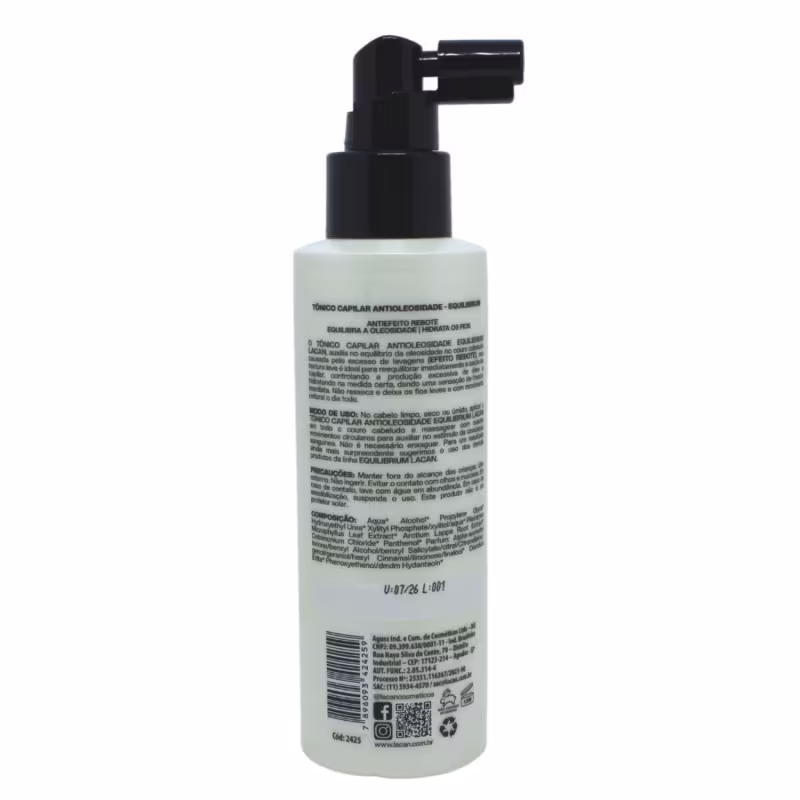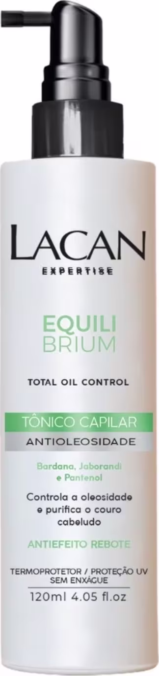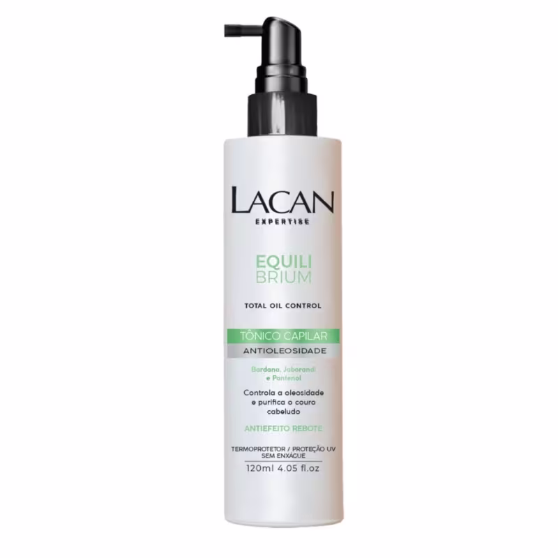 O TÔNICO CAPILAR ANTIOLEOSIDADE EQUILIBRIUM LACAN, auxilía no equilibrio da oleosidade no couro cabeludo causada pelo excesso de lavagens (EFEITO REBOTE), sua textura leve é ideal para reequilibrar imediatamente a saúde do capilar, controlando a produção excessiva de óleo e hidratando na medida certa, dando uma sensação de frescor imediata. Não resseca e deixa os fios leves e com movimento natural o dia todo.