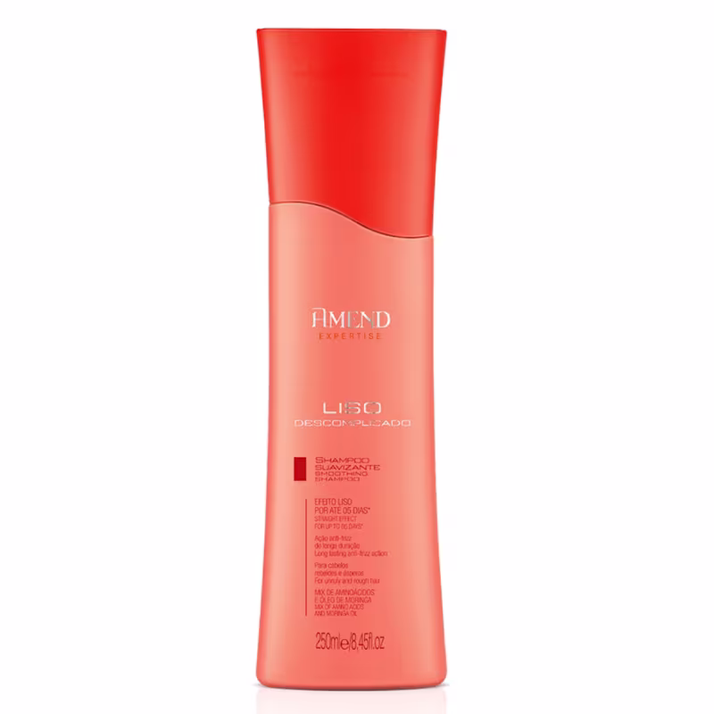 Shampoo Suavizante Amend Expertise Liso Descomplicado: Possui uma fórmula ultra avançada que garante até 05 dias* de cabelos lisos (quando usado em conjunto com demais produtos da linha). Com ação antifrizz, nutre intensivamente o fio rebelde. Dermatologicamente testado.