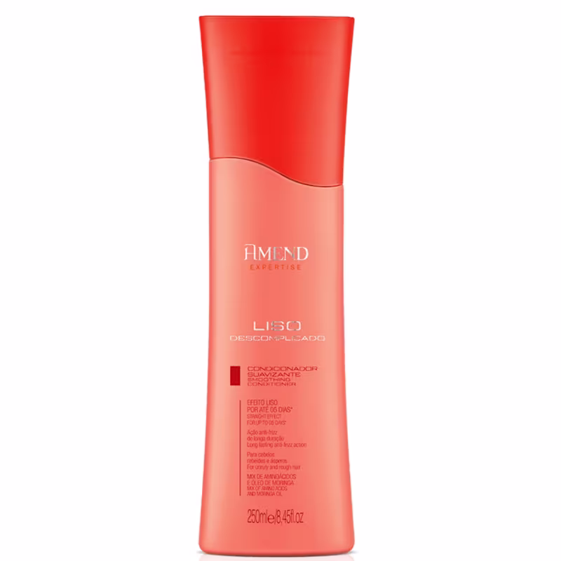 Condicionador Suavizante Amend Expertise Liso Descomplicado: Com fórmula ultra avançada garante até 05 dias* de cabelos lisos (quando usado em conjunto com demais produtos da linha de acordo com o modo de uso). Com ação antifrizz nutre intensivamente o fio rebelde. Prossiga o processo aplicando o Leave-in Suavizante da linha. Dermatologicamente testado