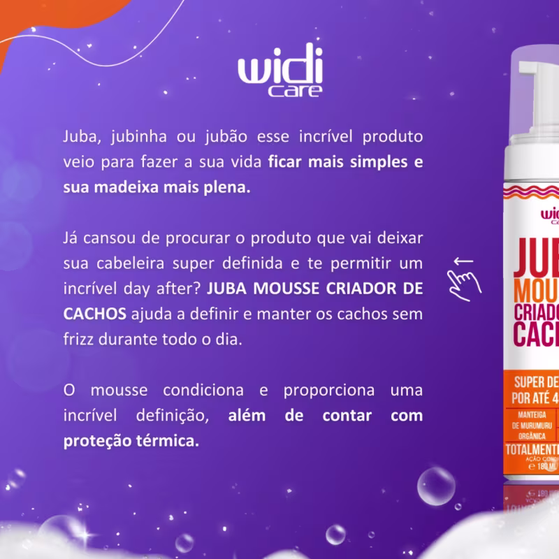 Juba, jubinha ou jubão esse incrível produto veio para fazer a sua vida ficar mais simples e sua madeixa mais plena. Já cansou de procurar o produto que vai deixar sua cabeleira super definida e te permitir um incrível day after? JUBA MOUSSE CRIADOR DE CACHOS ajuda a definir e manter os cachos sem frizz durante todo o dia. O mousse condiciona e proporciona uma incrível definição, além de contar com proteção térmica. Cabelos incrivelmente lindos, definidos, macios e sem frizz.
