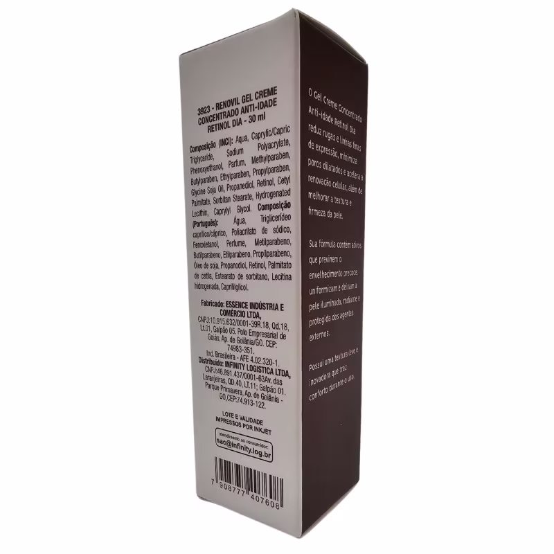 Finalidade: O Gel Creme Concentrado Anti-idade Retinol Dia reduz rugas e linhas finas de expressão, minimiza poros dilatados e acelera a renovação celular, além de melhorar a textura e firmeza da pele. Sua fórmula contém ativos que previnem o envelhecimento precoce, uniformizam e deixam a pele iluminada, radiante e protegida dos agentes externo. Possui uma textura leve e inovadora que traz conforto durante o uso.