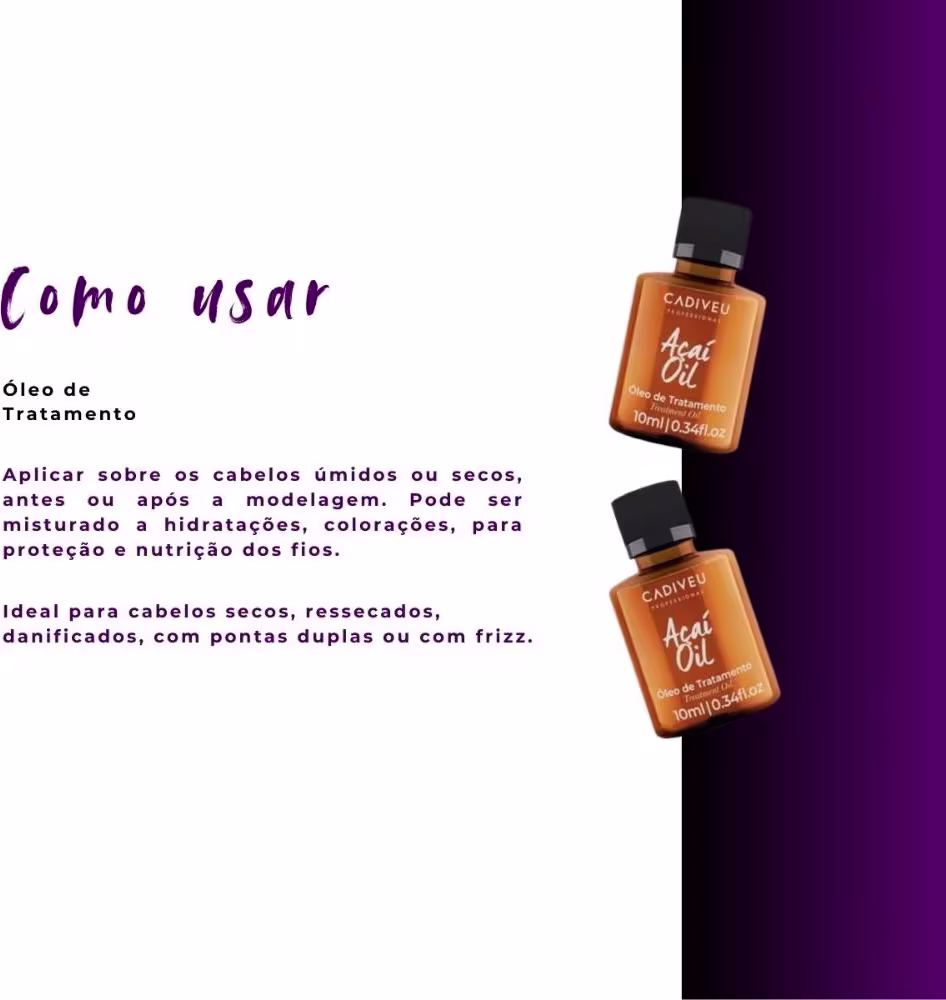 Aplique algumas gotas do óleo na palma das mãos e distribua nos cabelos secos ou úmidos, focando no comprimento e pontas. Pode ser utilizado antes ou depois da escovação para proteção térmica e finalização. Uso diário ou conforme necessário.
