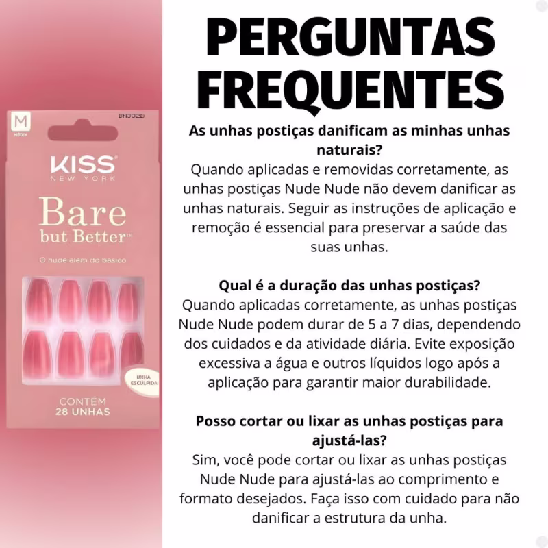 Quando aplicadas e removidas corretamente, as unhas postiças Nude Nude não devem danificar as unhas naturais. Seguir as instruções de aplicação e remoção é essencial para preservar a saúde das suas unhas.