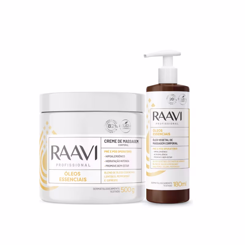 Transforme suas sessões de massagem em uma experiência única de relaxamento e cuidado. O Kit Creme E Óleo Massagem Pré Pós Operatório Corpo Raavi é o toque de luxo que sua pele merece!