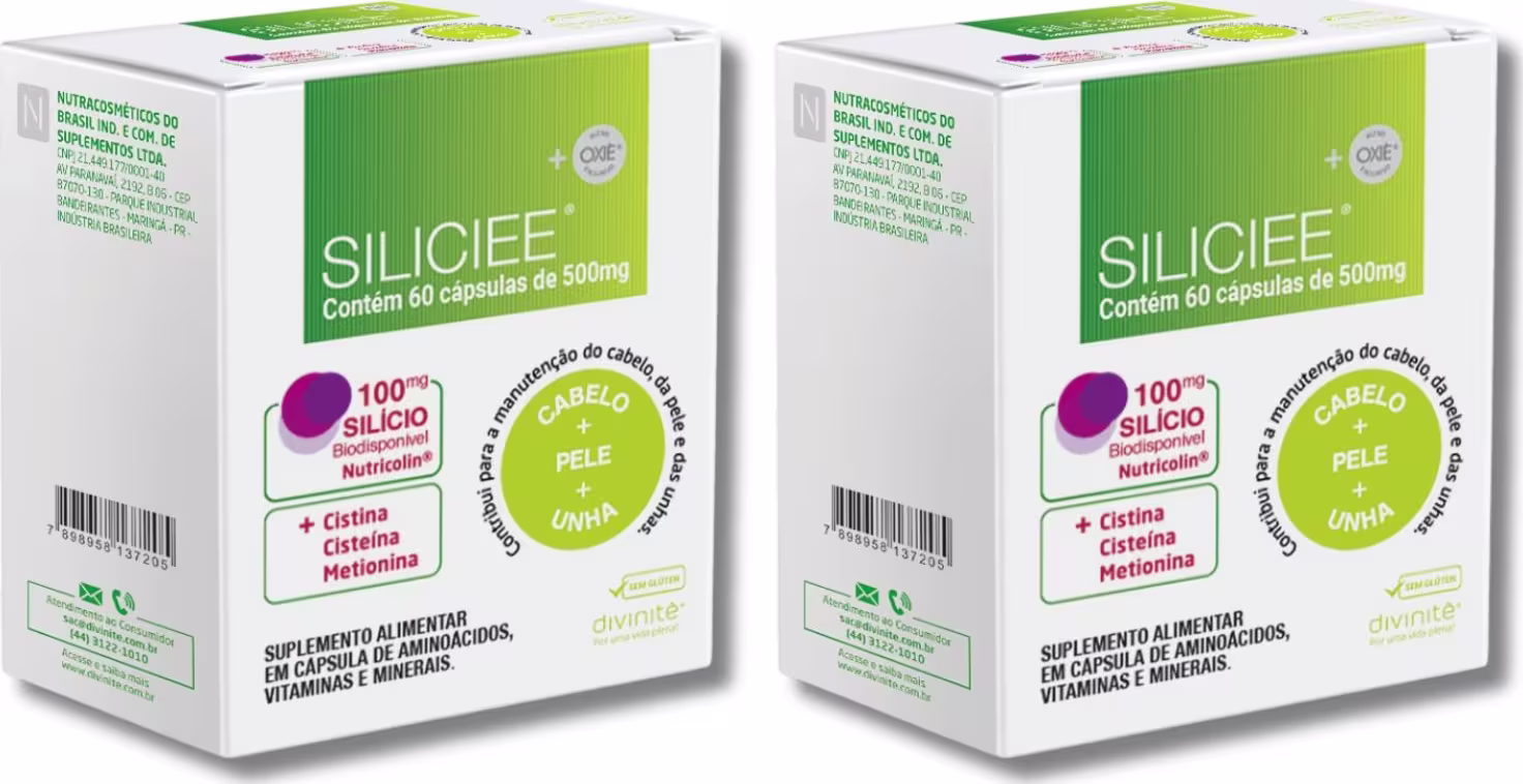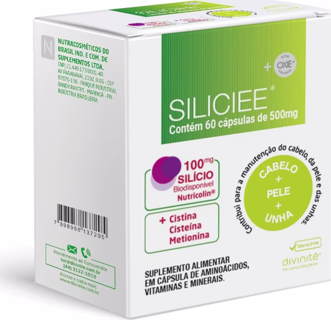 O complexo de Aminoácidos Cistina, Cisteína e Metionina foram cuidadosamente selecionados e estão em dosagens ideais para reposição desses nutrientes no seu organismo. São principais aminoácidos que compõem a molécula de queratina. O Produto Siliciee é enriquecido com Blend Oxiè - Associação exclusiva Divinitè, composta por Beta- Glucana de Saccharomyces cerevisiae, Vitamina C, Levedura Enriquecida com Selênio e Vitamina E para proporcionar suporte imunomodulatório à fórmula.