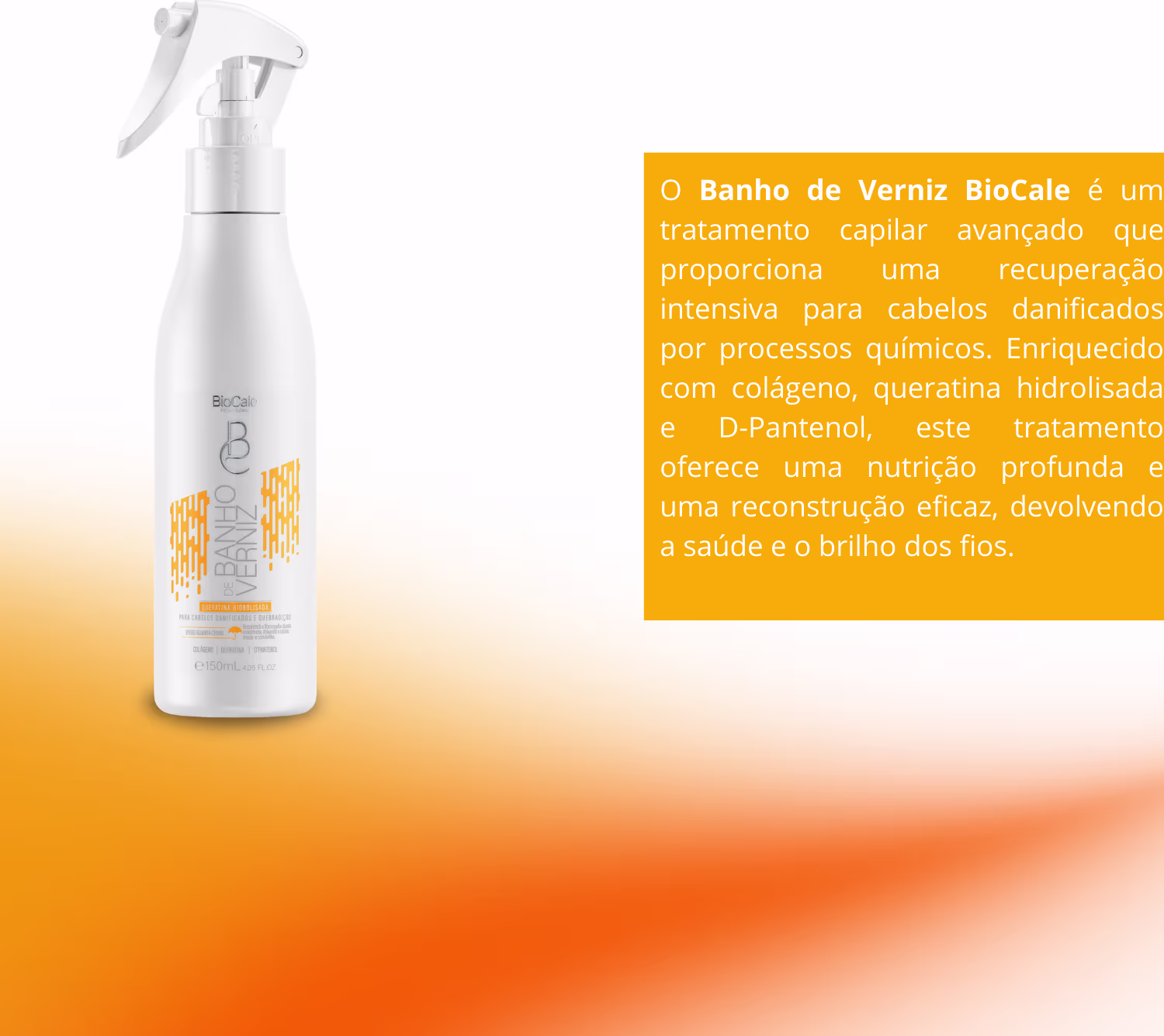 O Banho de Verniz BioCale é um tratamento capilar avançado que proporciona uma recuperação intensiva para cabelos danificados por processos químicos. Enriquecido com colágeno, queratina hidrolisada e D-Pantenol, este tratamento oferece uma nutrição profunda e uma reconstrução eficaz, devolvendo a saúde e o brilho dos fios.