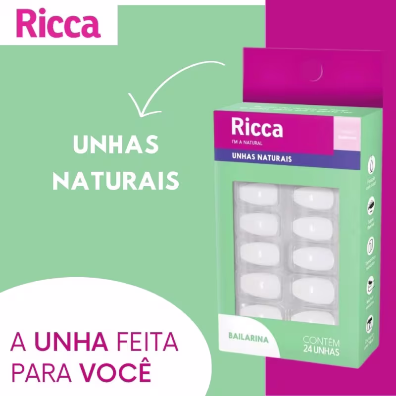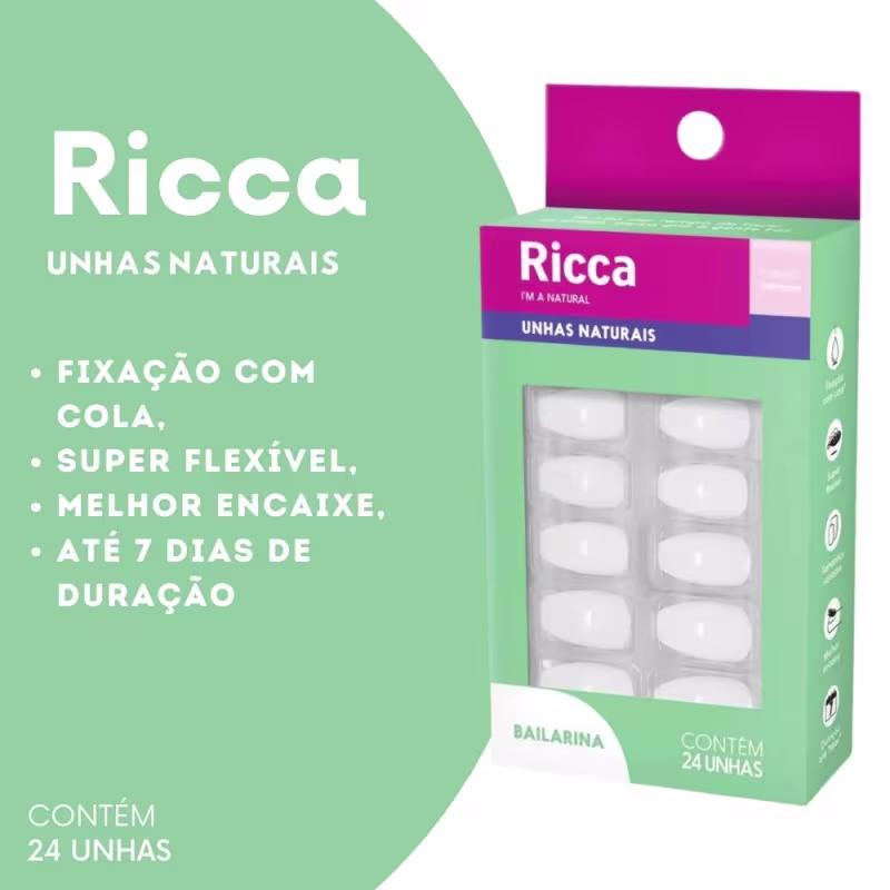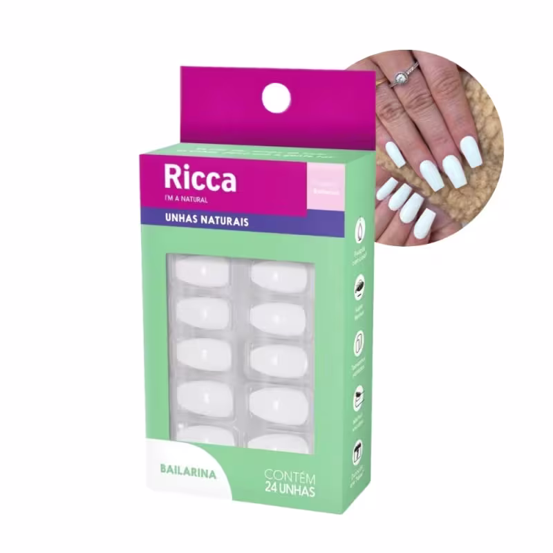 Não sei o CEPUnhas Postiças Naturais Formato Bailarina Fixação com Cola 24 Unhas Ricca