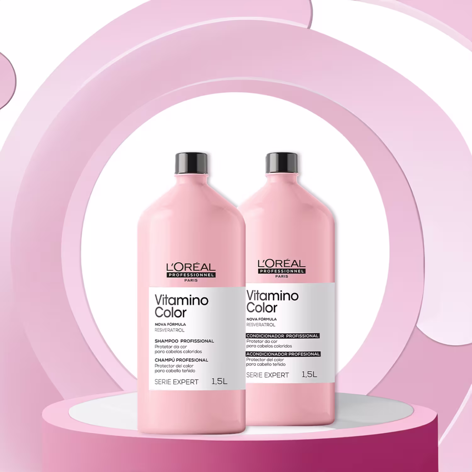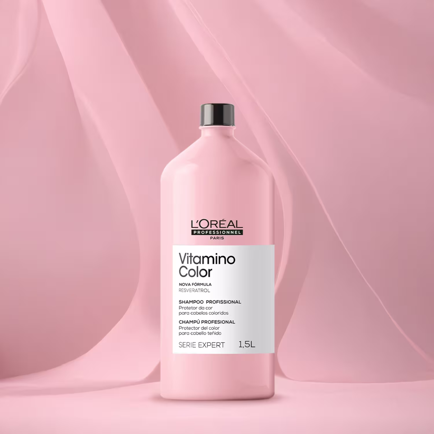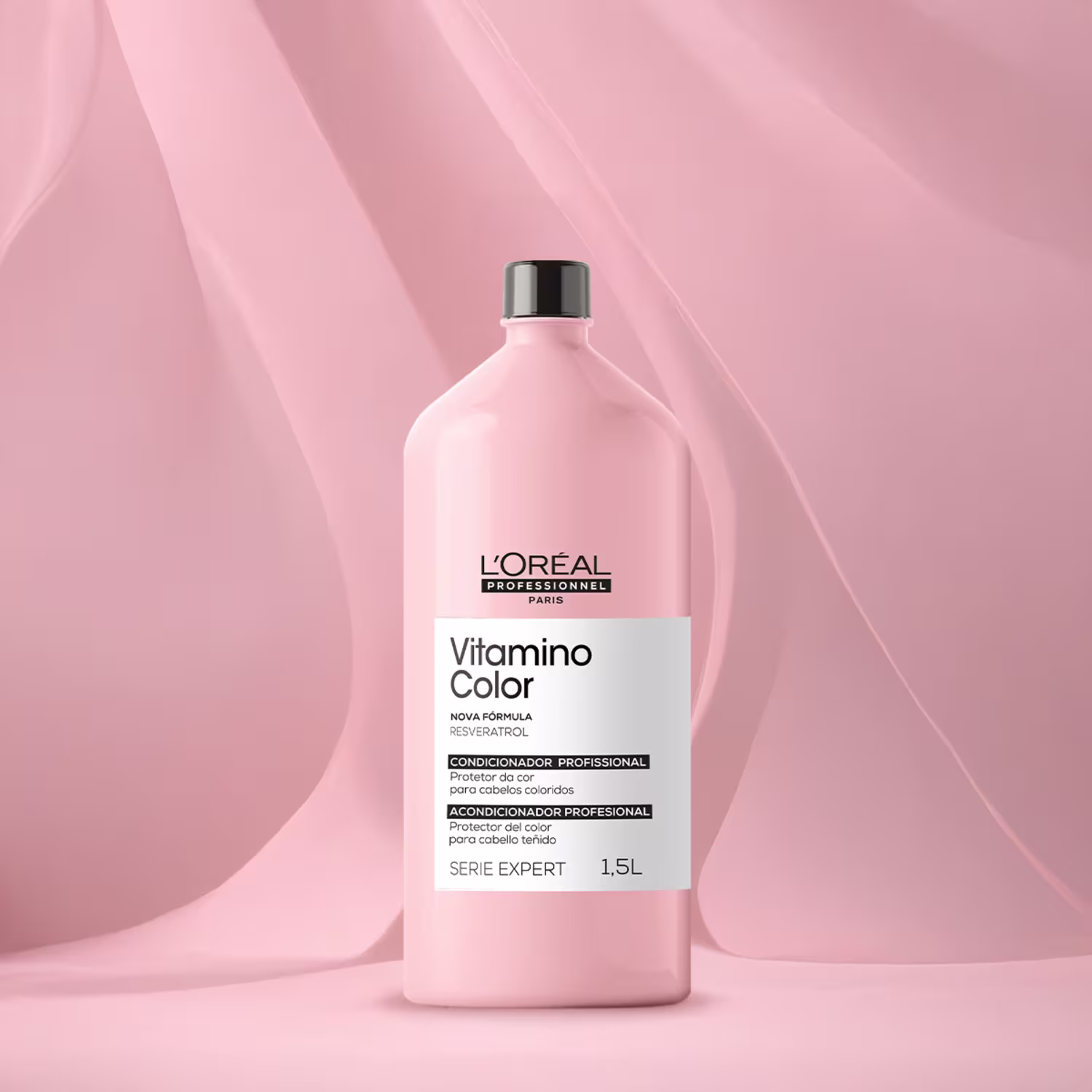 L'Oréal Professionnel Serie Expert Vitamino Color Condicionador 1,5L: traz como principal ingrediente, o resveratrol, um poderoso antioxidante presente na casca e nas sementes das uvas, que tem a função de preservar a cor dos cabelos. O resultado é um cabelo com 8 semanas de proteção da cor e 7x mais brilho.