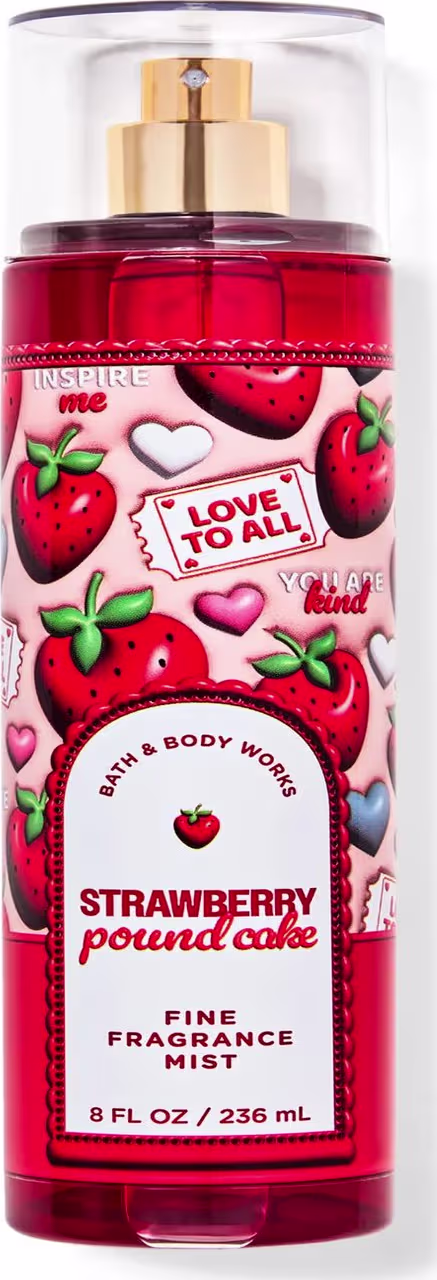 Body Splash Strawberry Pound Cake 236ml: fragrância doce de morangos, bolo dourado e chantilly.
