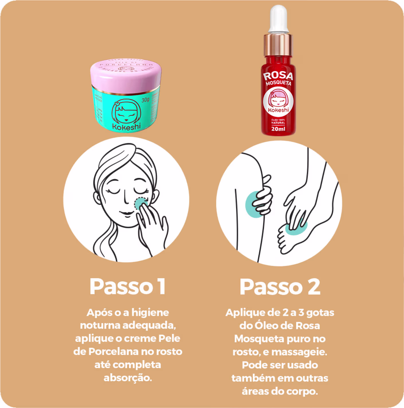 Após a higiene notuna da pele, aplicar na seguinte ordem: Pele de Porcelana e Óleo de