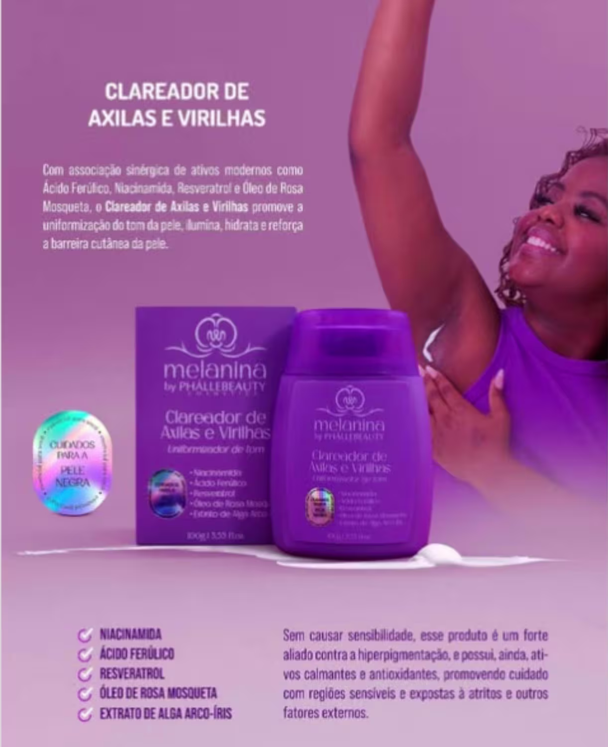 O Clareador de Axilas e Virilhas Melanina da PhálleBeauty é formulado com ativos modernos, como Ácido Ferúlico, Niacinamida, Resveratrol e óleo de rosa mosqueta. Esses ingredientes promovem a uniformização do tom da pele, iluminam, hidratam e reforçam a barreira cutânea.