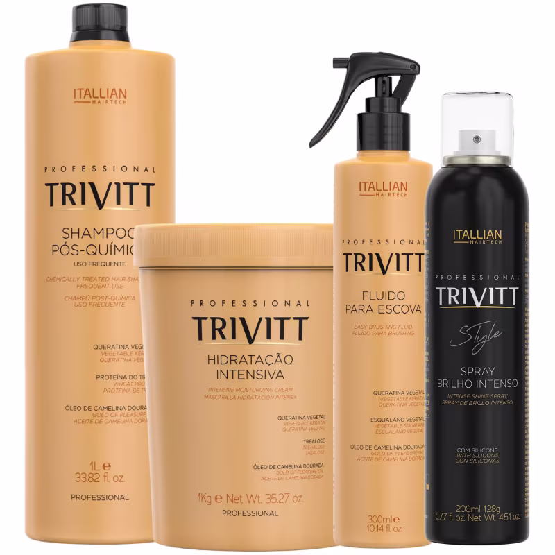Não sei o CEPContém:- brilho intenso trivitt style 200ml 128g- fluido para escova trivitt 300ml- hidratacao intensiva trivitt 1kg- shampoo pos-quimica para uso frequente trivitt 1lO Trivitt Style Spray de Brilho Intenso é um produto que dá luminosidade e proteção ao cabelo, realçando o penteado com brilho e deixando os fios macios e leves. Sua fórmula contém um blend de silicones que proporciona maciez, sedosidade, brilho radiante e toque aveludado não oleoso, além de filtro solar que protege os fios contra os danos UV-B. Para usar, basta aplicar sobre os cabelos secos, mantendo uma distância de 20 cm.O fluido para escova Trivitt é um produto para cabelos que contém proteção térmica e ajuda a evitar as pontas duplas. Sua fórmula contém filtro solar, queratina, óleo de Camelina Dourada e emulsão de silicone, que juntos restauram as partes danificadas dos fios, reequilibram o teor de água e a distribuição de cargas elétricas da fibra capilar, além de proporcionar brilho intenso e maciez. O produto deve ser vaporizado em pequenas quantidades nos cabelos limpos e úmidos, mantendo a embalagem na posição vertical e a uma distância de aproximadamente 20 cm, antes de proceder à escova com secador.A Hidratação Intensiva é recomendada para todos os tipos de cabelo, pois repara danos, hidrata, dá brilho e condiciona os fios. Ela penetra na fibra capilar e fortalece os fios contra a quebra com ingredientes altamente hidratantes, que selam as cutículas e repõem a hidratação perdida por mais tempo. Os ativos incluem Trealose, que hidrata profundamente e protege contra agentes externos, Queratina, que restaura os fios e mantém as cutículas seladas, e Óleo de Camelina Dourada, que restaura o teor lipídico, combate o toque áspero e recupera a elasticidade dos fios. O modo de uso é aplicar nos cabelos limpos e úmidos, massageando suavemente mecha por mecha, deixando agir por 5 minutos e enxaguando. Para escovar com secador, é recomendado aplicar antes o Fluido para Escova Trivitt.O shampoo pós-química Trivitt é indicado para cabelos quimicamente tratados que precisam de cuidados específicos. Ele contém proteína do trigo, que confere brilho, melhora a penteabilidade e mantém os fios maleáveis, além de queratina, que restaura os fios, reequilibra o teor de água e mantém as cutículas seladas. O óleo de Camelina Dourada, de origem vegetal, fornece Ômegas 3 e 6 para restaurar a oleosidade natural dos cabelos, combater o ressecamento e recuperar a elasticidade e flexibilidade dos fios. O modo de uso é aplicar nos cabelos úmidos, massagear suavemente, enxaguar e repetir a aplicação.