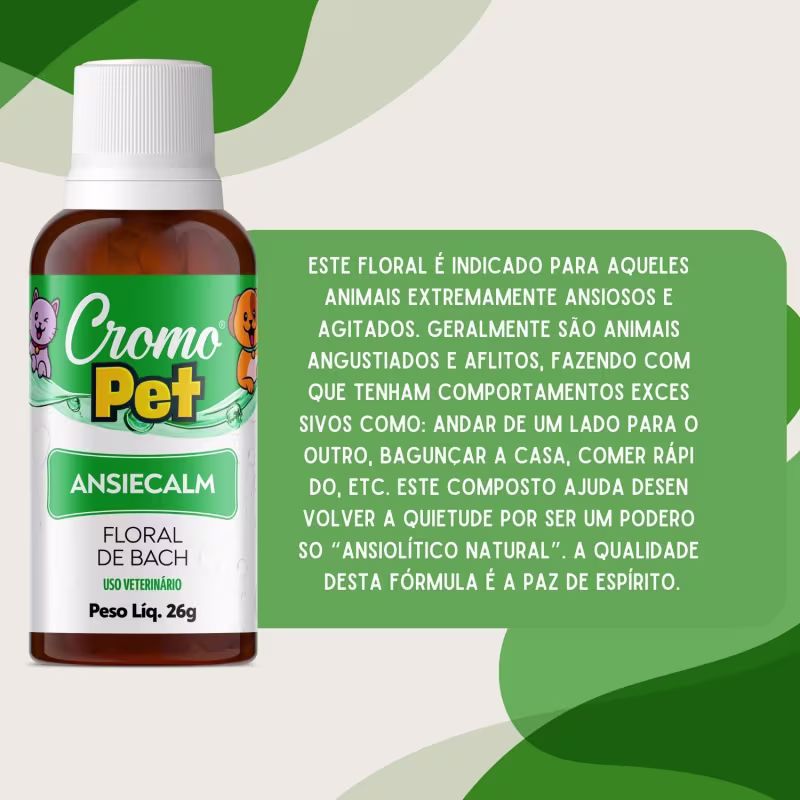 O CromoPet Ansiecalm foi formulado para auxiliar animais que apresentam ansiedade, inquietação e agitação excessiva. Indicado para pets que demonstram comportamentos como andar de um lado para o outro, bagunçar objetos, comer rápido ou se mostrarem aflitos sem motivo aparente. Sua fórmula ajuda a promover calma e equilíbrio emocional, proporcionando bem-estar ao animal.