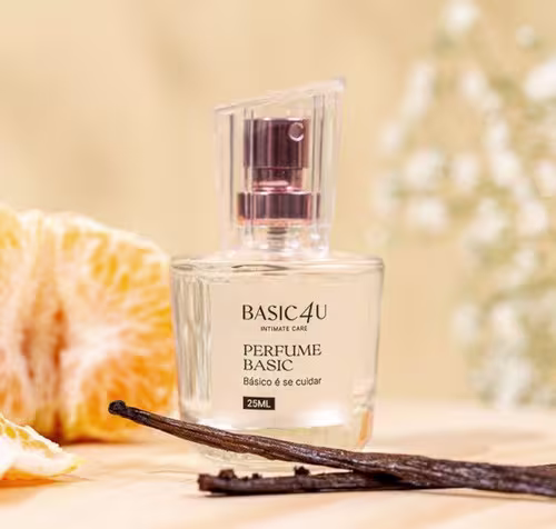 Perfume íntimo Basic4u com óleos essenciais afrodisíacos, notas cítricas, e pH adequado.