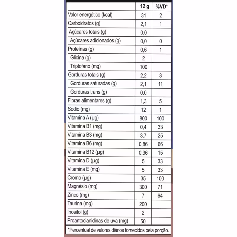 Triglicerídeos de cadeia média C8 + C10 (TCM), Glicina, Inositol, Cacau em Pó Alcalino, Carbonato de Magnésio, Inulina Obtida da Raiz de Chicória, Taurina, L-Triptofano, Sais de Magnésio de Ácido Cítrico, Extrato Seco de Semente de Uva, Acetato de dl-alfa-tocoferila (Vitamina E), Complexo de Vitaminas B (Tiamina (Vitamina B1), Nicotinamida (Vitamina B3), Piridoxina (Vitamina B6), Cianocobalamina (Vitamina B12)), Zinco Quelado (Bisglicinato de zinco), Acetato de retinol (Vitamina A), Picolinato de cromo, Colecalciferol (Vitamina D), Espessantes: Goma Acácia e Xantana. Edulcorante Glicosídeos de Esteviol de Stevia Rebaudiana Bertoni e Aromatizantes.