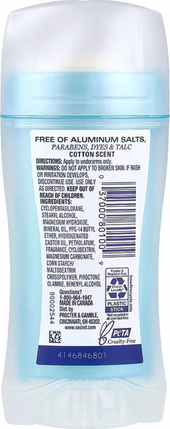 O desodorante secreto sem alumínio oferece até 48 horas de proteção contra odores, livre de alumínio, parabenos, corantes e talco. A nova fórmula em bastão seco é certificada como livre de crueldade pela PETA e foi projetada para ser suave e, ao mesmo tempo, fornecer proteção premium contra odores. Feito com o ingrediente hidratante nº 1 recomendado pelo dermatologista e 3x mais combatentes de odores *, o Desodorante Secreto Sem Alumínio continua suave e funciona o dia todo para ajudar a mantê-lo se sentindo fresco, confiante e sem odores.