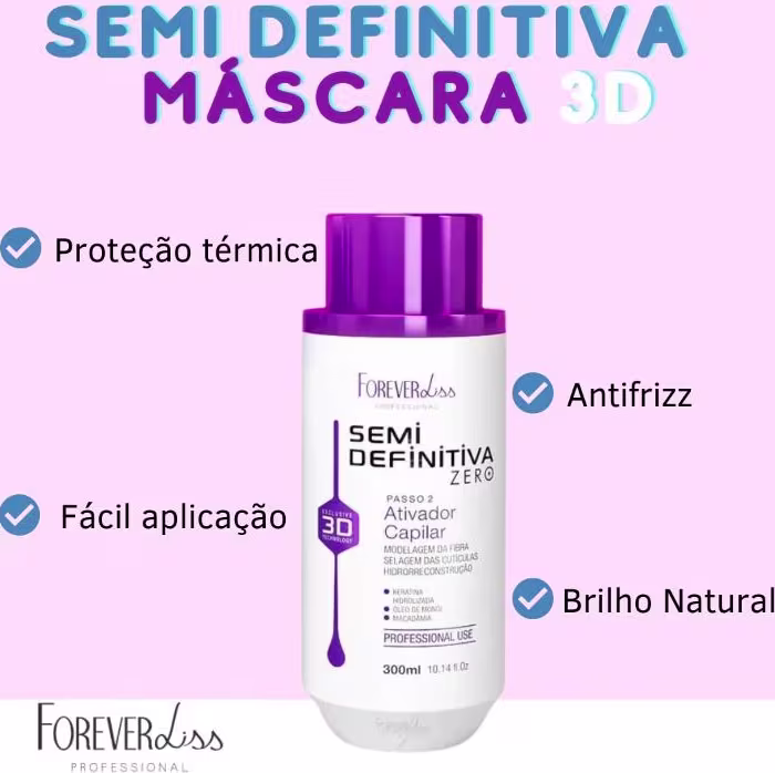 A Escova Semi Definitiva Forever Liss é adorada e desejada entre os profissionais da beleza: Sua tecnologia única no mercado, desenvolvida pela Forever Liss Professional® - a "Hair System Premium 3D" - é considerada uma das melhores do mundo e proporciona reestruturação capilar com total segurança, sem danificar e agredir os fios, nem exalar cheiros fortes, como nas progressivas.