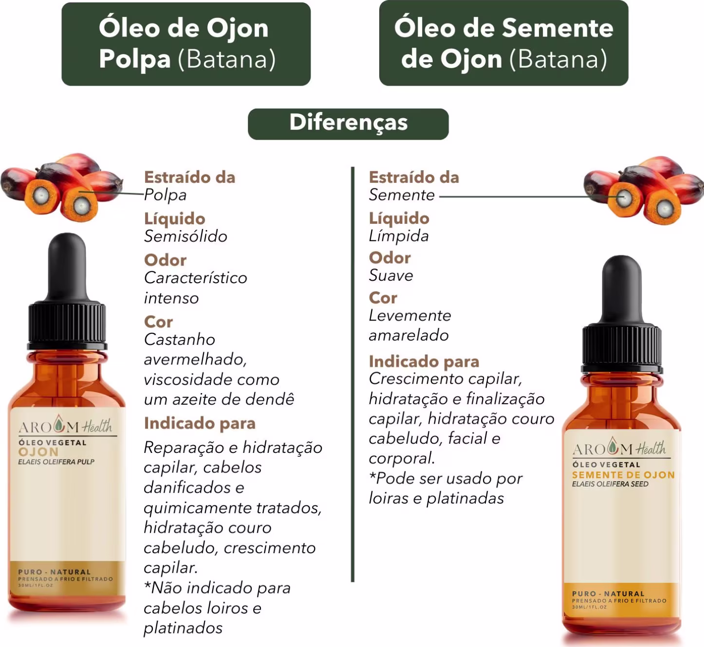 Óleo vegetal de Ojon da polpa ( Batana) , prensado a frio e filtrado da polpa pura da batana, possui viscosidade semissólido, cor avermelhada , aspecto de um azeite de dendê, aroma forte intenso, em temperaturas baixas pode solidificar ( endurecer) sendo necessário colocar no banho maria para voltar ao estado líquido, esse processo não interfere nas propriedades natural do óleo.
