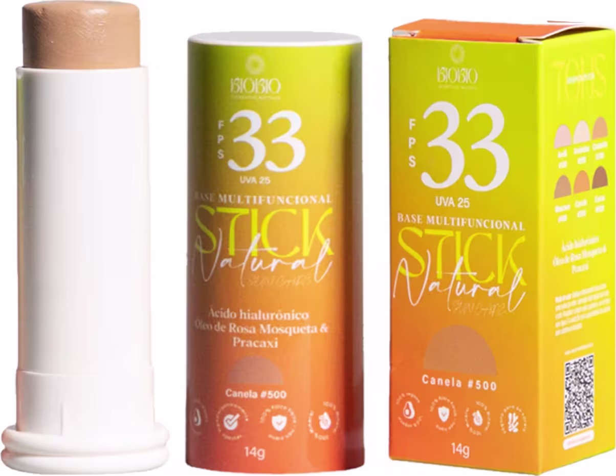 Não sei o CEPBase Stick BioBio cosméticos com FPS 33 e UVA 25 e ativos de skincare, disponível em 8 tons. Fácil de aplicar, livre de toxinas, fórmula limpa e proteção solar física. Cobertura construível, média a alta que funciona também como corretivo e contorno. Cobre manchas, olheiras, melasma e deixa a pele com um acabamento natural.