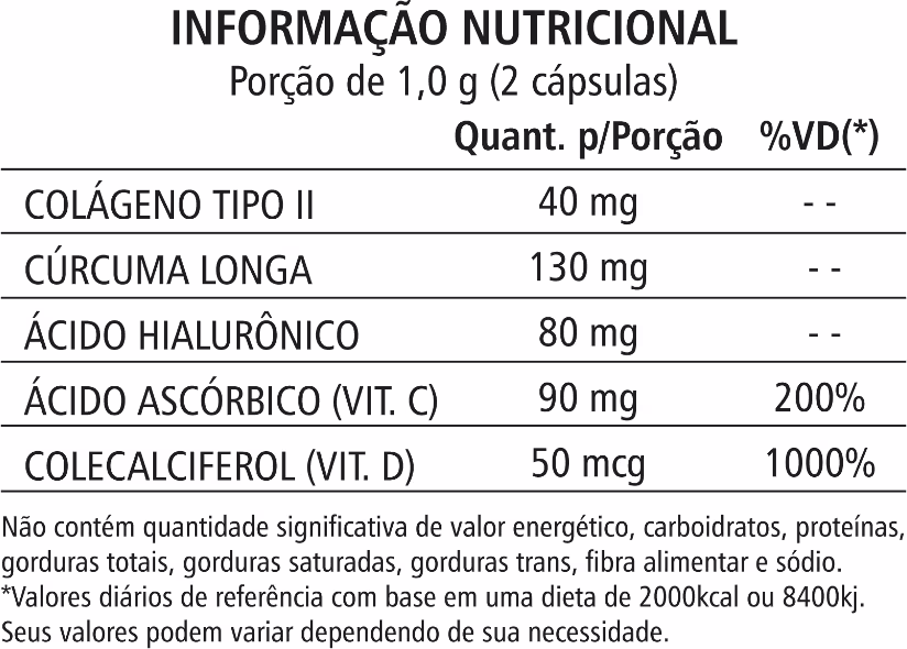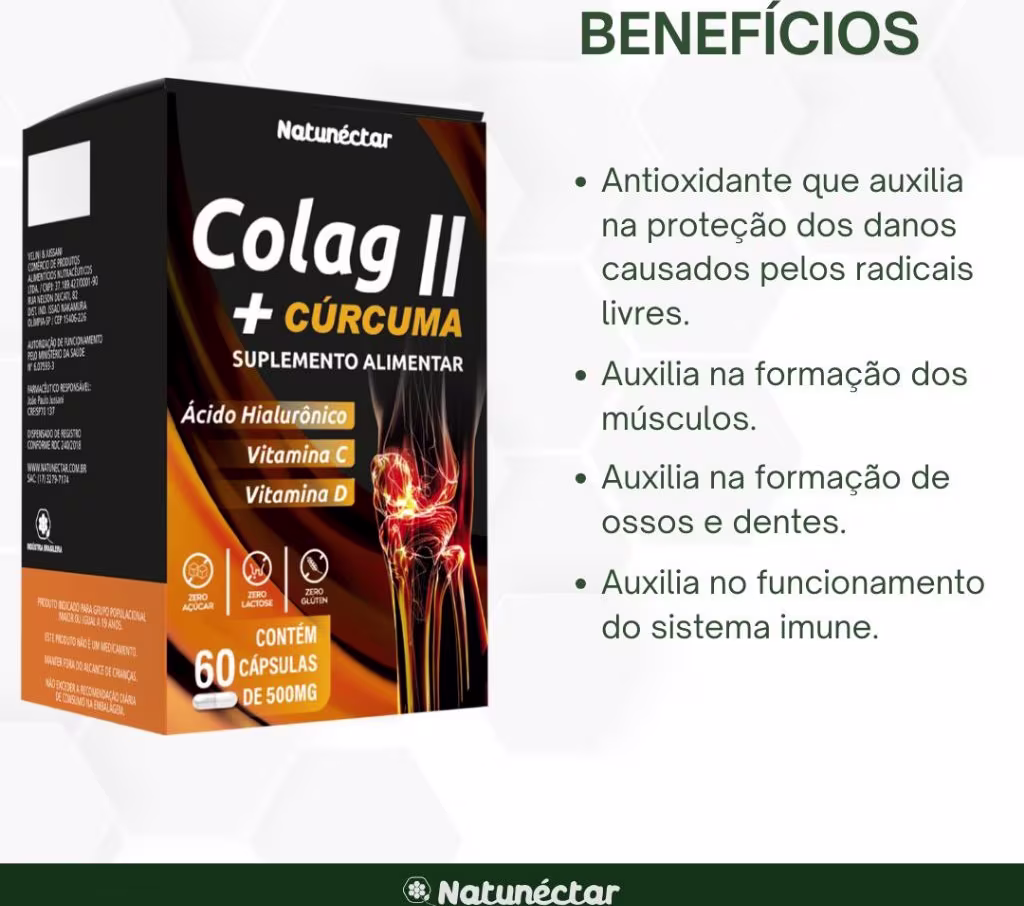 COLÁGENO TIPO II + CURCUMA + ÁCIDO HIALURÔNICO + VITAMINA C + VITAMINA D 60 CÁPSULAS - Natunéctar Ver mais ❯