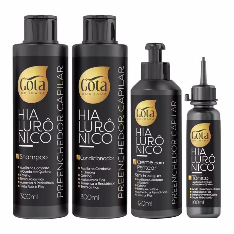 O Ácido Hialurônico é um potente preenchedor dos fios e proporciona hidratação, combatendo a quebra capilar. A Cafeína fortalece a raiz e os fios promovendo um crescimento saudável e raízes mais fortes. A Linha Hialurônico e Cafeína Gota Dourada é uso essencial para resultados surpreendentes, cabelos maravilhosos e saudáveis com restauração, brilho e maciez.