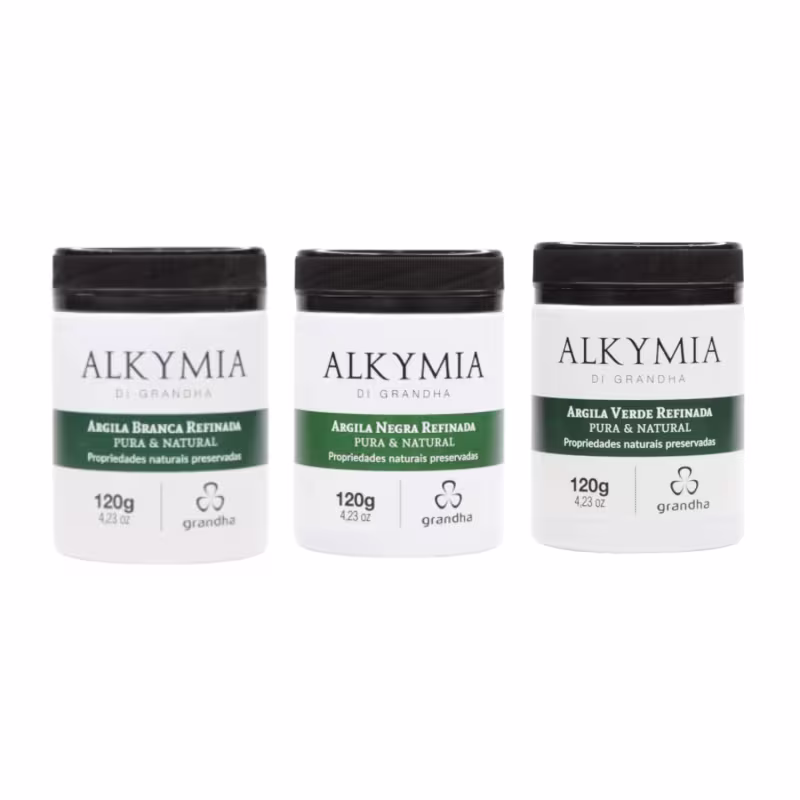 A argila branca de Alkymia di Grandha é refinada e possui toque sedoso e aveludado, com amplo potencial de clareamento da pele para o tratamento de manchas, além de cicatrizante e hidratante. Absorve a oleosidade sem desidratar a pele e o cabelo. Possui toque refrescante e proporciona sensação de bem-estar. Comumente aplicada em máscaras faciais e tratamentos de cabelos secos e desidratados. Um clássico da argiloterapia.
