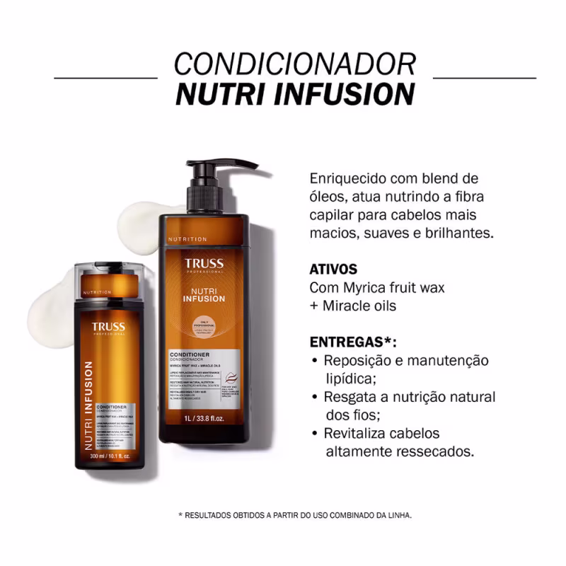 Não sei o CEPKit Truss Condicionador Nutri Infusion Duo é um produto desenvolvido para complementar o tratamento oferecido pelo shampoo da linha Nutri Infusion. Proporciona uma nutrição intensa, hidratação prof
