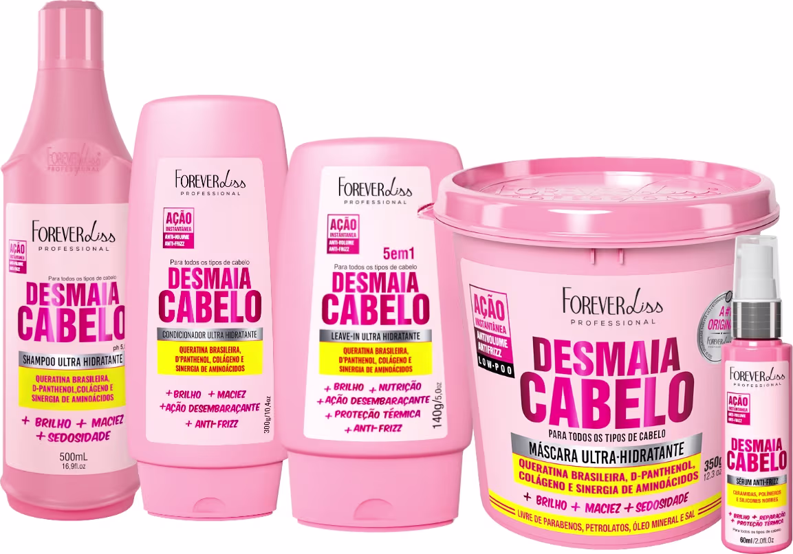 O Kit Completo Cuidado Capilar Desmaia Cabelo Forever Liss foi desenvolvido para transformar seus fios, deixando-os mais macios, sedosos e com aquele brilho irresistível.