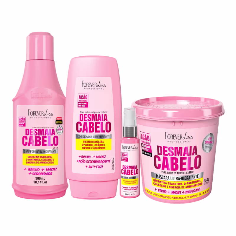 Transforme seu cabelo com o Kit Desmaia Forever Liss e sinta a diferença! Cabelos lisos, macios e com brilho intenso. Não perca a oportunidade de garantir o seu agora e arrasar com fios impecáveis!
