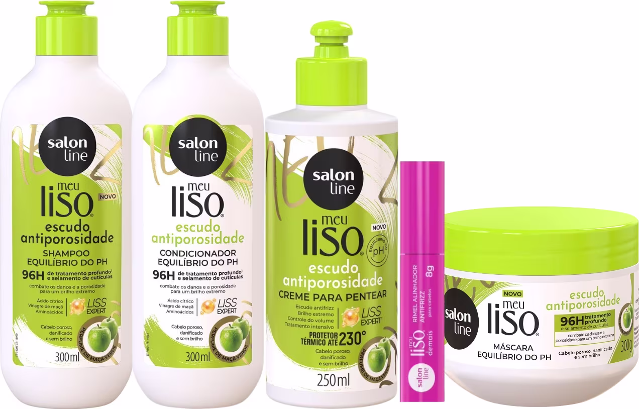 O Kit Completo Meu Liso Escudo Antiporosidade Maça Salon Line é a solução que você precisa para blindar os fios contra a porosidade e trazer de volta o brilho e a maciez dos seus cabelos!