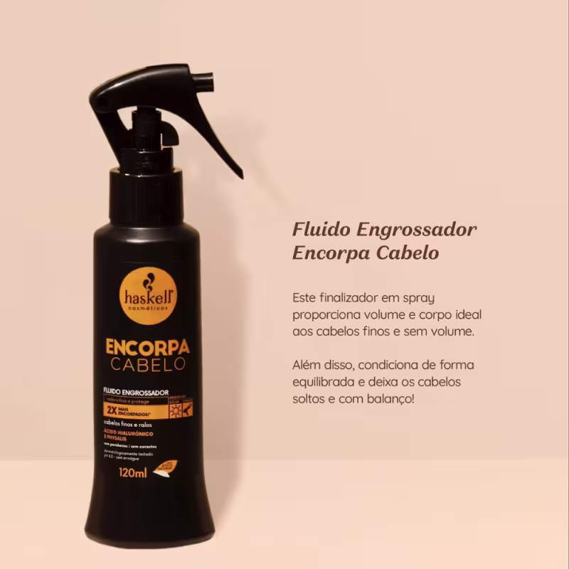 A linha Encorpa Cabelo foi desenvolvida para engrossar e reestruturar os cabelos finos e ralos. Sua fórmula redensificadora, associada ao ácido hialurônico e ao physalis, promove o aumento da espessura do fio, revitaliza o couro cabeludo e confere brilho e hidratação, mantendo o balanço natural dos fios. O resultado são cabelos mais densos, saudáveis e até 2 vezes mais encorpados.