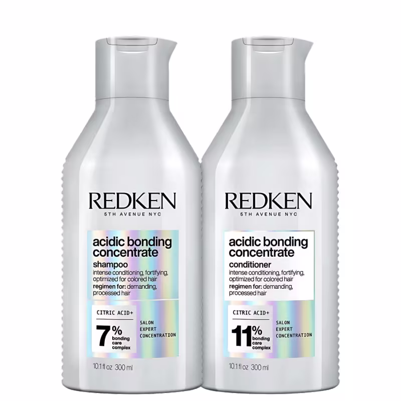 Kit com shampoo e condicionador. Redken Acidic Bonding Concentrate Duo Padrão remove as impurezas, enquanto hidrata o comprimento, em casa.