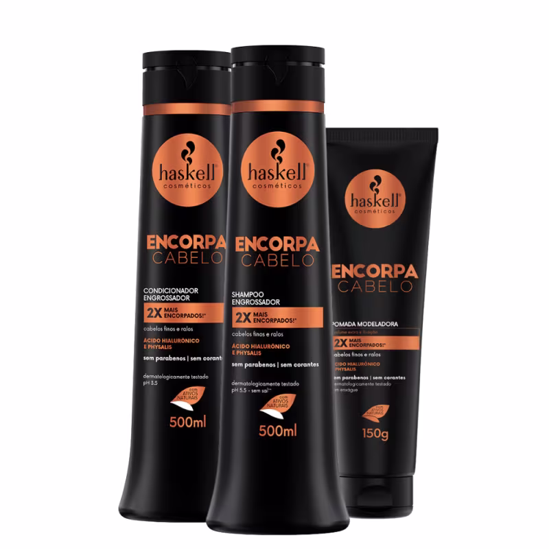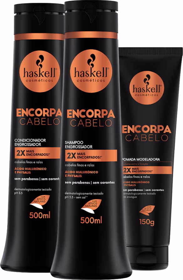 A linha Encorpa Cabelo foi desenvolvida para engrossar e reestruturar os cabelos finos e ralos. Sua fórmula redensificadora, associada ao ácido hialurônico e ao physalis, promove o aumento da espessura do fio, revitaliza o couro cabeludo e confere brilho e hidratação, mantendo o balanço natural dos fios. O resultado são cabelos mais densos, saudáveis e até 2 vezes mais encorpados.
