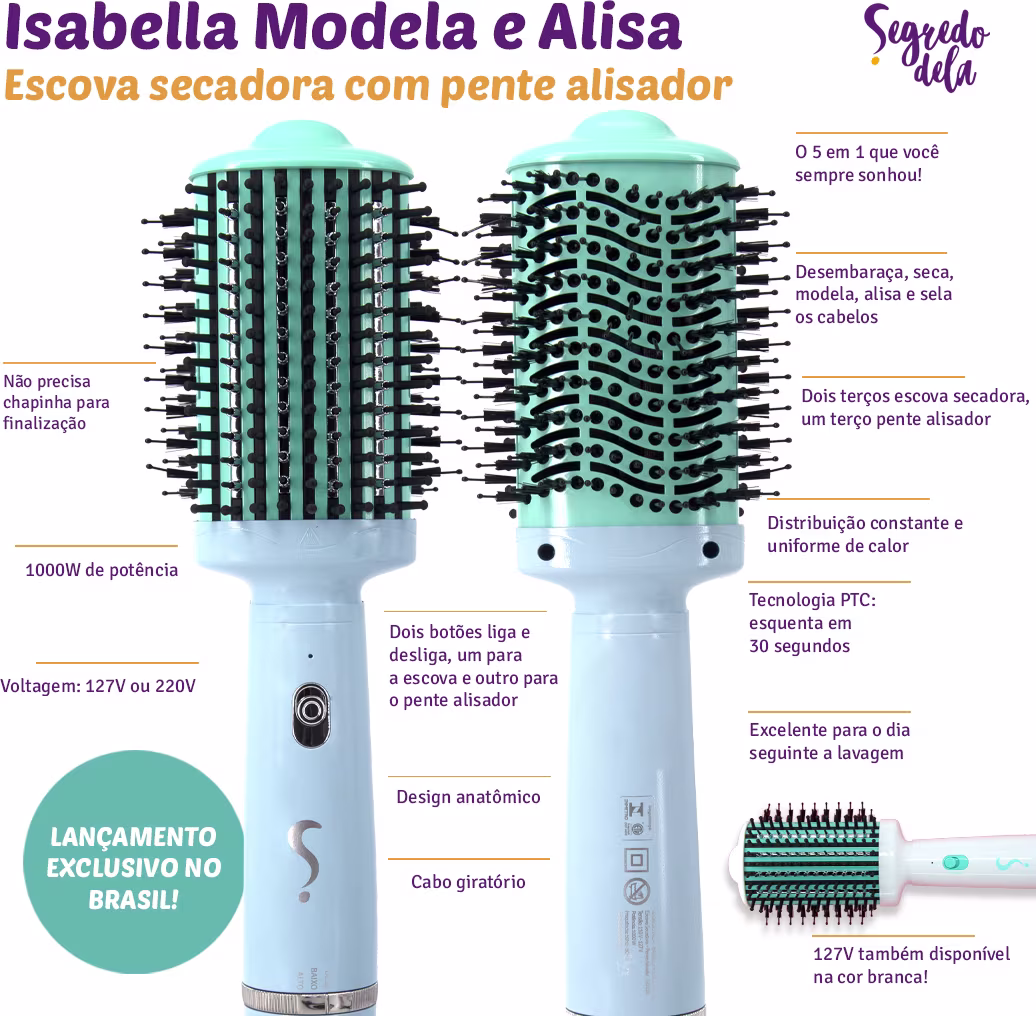 A Escova Secadora + Pente Alisador Isabella, é um lançamento inédito no Brasil e mundo e exclusividade da Segredo Dela! Chegou para realizar os desejos de todas as mulheres e revolucionar o mercado das Escovas Secadoras. Com a Isabella você consegue secar, alinhar e selar os fios, obtendo um efeito arrasador rapidamente!