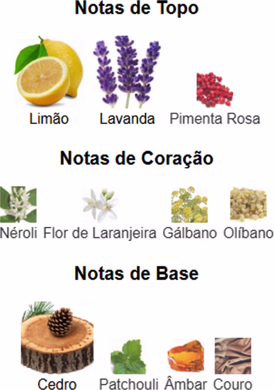 Notas de Topo: Limão, Lavanda e Pimenta Rosa.