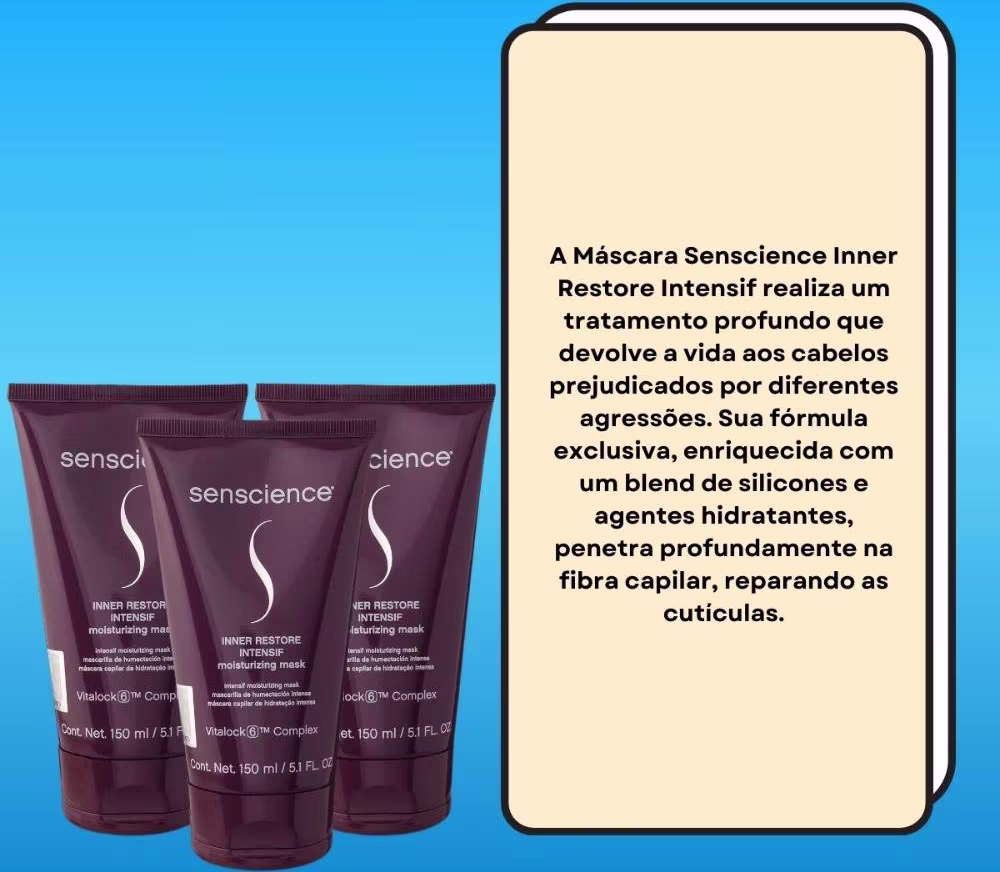 A Máscara Senscience Inner Restore Intensif possui uma fórmula inovadora, enriquecida com polímeros umectantes, que reequilibram o nível de nutrição dos fios, proporcionando uma reconstrução profunda e intensa.