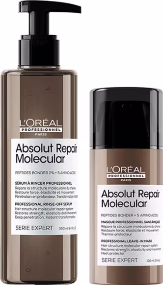 O Kit L'Oréal Professionnel Absolut Repair Molecular contém 1 Leave-in com 100 ml e 1 Sérum com 250 ml. O Sérum repara até 2 anos de danos capilares a nível molecular, desde à raiz, reconstrói a estrutura molecular do cabelo, devolve 3x mais força, elasticidade e movimento ao cabelo instantaneamente, após o uso os fios transformam-se visivelmente, com muito brilho e maciez. O Leave-in repara a estrutura macromolecular dos cabelos em até 2 anos de danos capilares, proporciona maciez, brilho, protege das agressões externas e do calor de até 230°C, oferece 97% mais força, elasticidade e o movimento dos cabelos. Kit para todos os tipos de cabelo, danificados e muito danificados. L'Oréal Professionnel Absolut Repair Molecular, penetra profundamente na fibra capilar e reconstrói sua estrutura molecular. Com tecnologia exclusiva do concentrado de 2% Ligantes Peptídicos + 5 Aminoácidos que decompõe os peptídeos em seus componentes fundamentais e são injetados na fibra capilar. Essa ação revolucionária de L'Oréal resulta na reconstrução completa da estrutura molecular do cabelo. Benefícios: Elasticidade; 97% mais força; Proteção Térmica de até 230°; Rápida Absorção; Brilho; Maciez; Repara até 2 anos de danos capilares; Reconstrói a estrutura molecular do cabelo. Modo de usar: Divida o cabelo molhado ao meio, pressione de 2 a 3 pumps do Sérum por mecha e distribua uniformemente do comprimento às pontas. Deixe o sérum agir no cabelo de 1 a 2 minutos e enxágue bem. Desembarace o cabelo, depois de seco com a toalha. Divida o cabelo ao meio e utilize 1 pump para cada mecha. Distribua o Leave-in uniformemente do comprimento às pontas. Seque o cabelo naturalmente ou com secador. Não é necessário enxaguar.