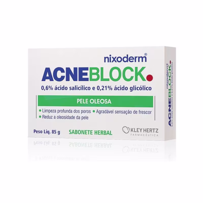 Acneblock Sabonete Herbal é indicado para pele oleosa, limpando profundamente os poros, reduzindo a oleosidade excessiva da pele e possuindo uma agradável sensação de frescor