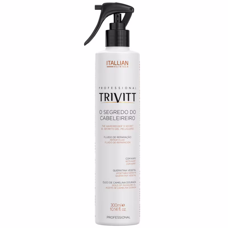O fluido para escova Trivitt é um produto para cabelos que contém proteção térmica e ajuda a evitar as pontas duplas. Sua fórmula contém filtro solar, queratina, óleo de Camelina Dourada e emulsão de silicone, que juntos restauram as partes danificadas dos fios, reequilibram o teor de água e a distribuição de cargas elétricas da fibra capilar, além de proporcionar brilho intenso e maciez. O produto deve ser vaporizado em pequenas quantidades nos cabelos limpos e úmidos, mantendo a embalagem na posição vertical e a uma distância de aproximadamente 20 cm, antes de proceder à escova com secador.