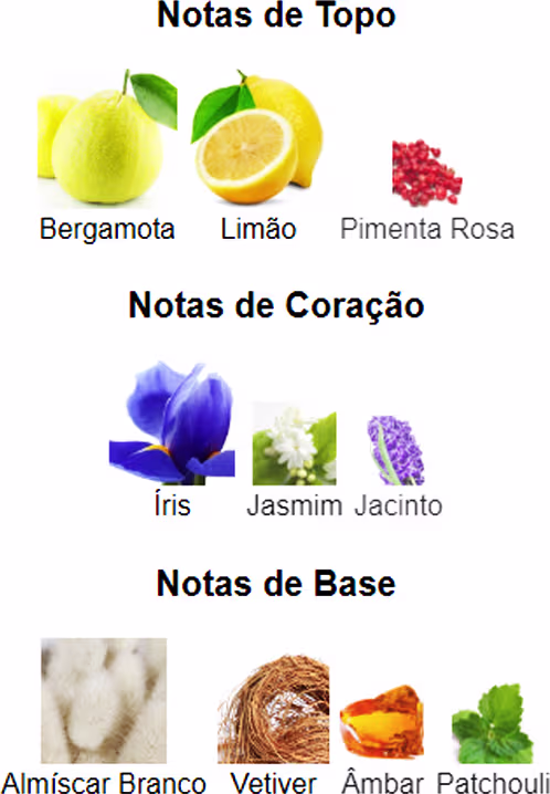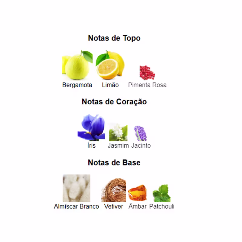 Notas de Topo: Bergamota, Limão e Pimenta Rosa.