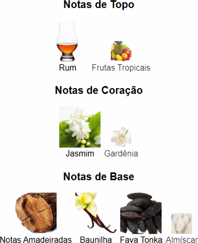 Notas de Base: Notas Amadeiradas, Baunilha, Fava Tonka e Almíscar.